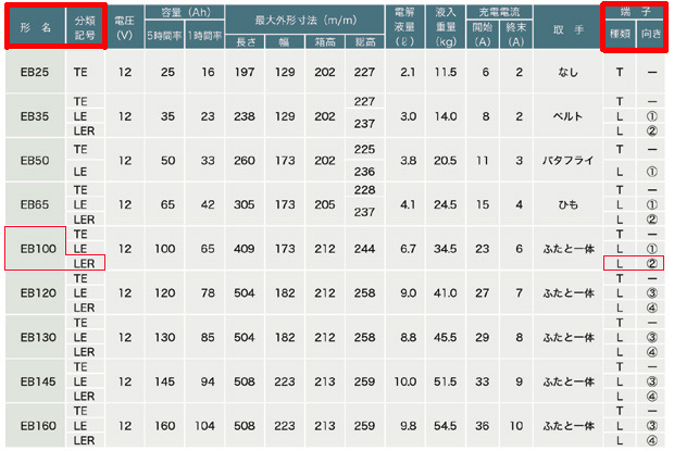 | GSユアサ サイクルバッテリー【Grand Star】シリーズは、EB25?EB160の9種類の容量、 【L型端子(内向き・外向き)】・【テーパー端子】の選択で26品番をラインナップ! |
