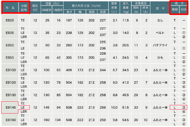| GSユアサ サイクルバッテリー【Grand Star】シリーズは、EB25?EB160の9種類の容量、 【L型端子(内向き・外向き)】・【テーパー端子】の選択で26品番をラインナップ! |