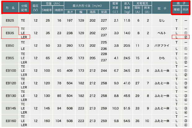 | GSユアサ サイクルバッテリー【Grand Star】シリーズは、EB25?EB160の9種類の容量、 【L型端子(内向き・外向き)】・【テーパー端子】の選択で26品番をラインナップ! |