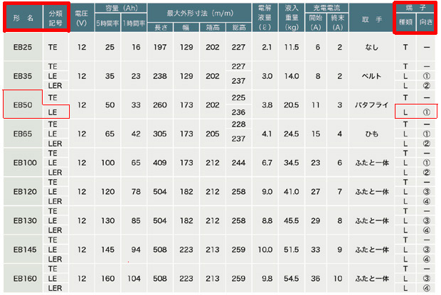 | GSユアサ サイクルバッテリー【Grand Star】シリーズは、EB25?EB160の9種類の容量、 【L型端子(内向き・外向き)】・【テーパー端子】の選択で26品番をラインナップ! |