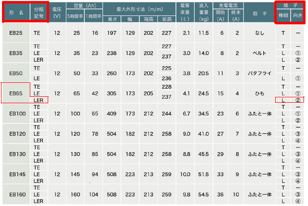 | GSユアサ サイクルバッテリー【Grand Star】シリーズは、EB25?EB160の9種類の容量、 【L型端子(内向き・外向き)】・【テーパー端子】の選択で26品番をラインナップ! |