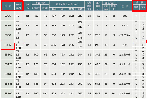 | GSユアサ サイクルバッテリー【Grand Star】シリーズは、EB25?EB160の9種類の容量、 【L型端子(内向き・外向き)】・【テーパー端子】の選択で26品番をラインナップ! |