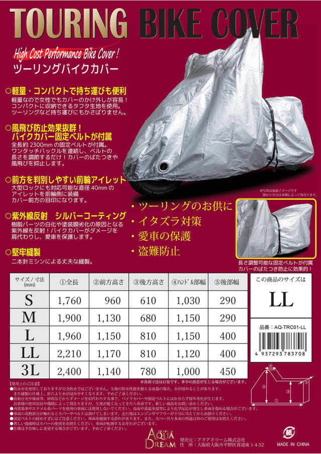 製品名: AQ-TRC-LL 鍵穴付タフタ バイクカバー LLサイズ AQUA DREAM アクアドリーム ツーリング イタズラ対策 盗難防止 送料無料 (一部地域除く)